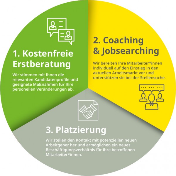 Durch individuelles Coaching und gezieltes Jobscouting finden unsere Experten für Ihre Mitarbeiter und Mitarbeiterinnen ein passgenaues neues Beschäftigungsverhältnis. Praxisnahes Fachwissen und eine vertrauensvolle Zusammenarbeit ermöglichen eine optimale Lösung für Sie und Ihre Mitarbeiter und Mitarbeiterinnen.